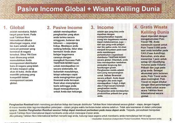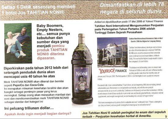 Noni Tahitian Noni International (TNI), a subsidiary of Morinda Holdings, Inc., is a multi-level marketing company that markets products made from the noni plant.[4] Founded in 1996 and based in Provo, Utah, TNI employs approximately 1500 employees worldwide and claims total yearly sales in the range of $500 million.[5] TNI has manufacturing plants in Tahiti[6], Japan, China, Germany, and the U.S. (American Fork, Utah). Products TNI's main product is Tahitian Noni Juice, which retails for $45.00 U.S. per 1-L bottle[7]. The company also markets the HIRO line of beverages, (e.g. Thermo, Energy, Mobility, and Vitality), which retail for $87 U.S. for a 24-pack of 250-mL cans, as well as various beauty and personal care products, teas (Tahiteas), food products, and dietary supplements.[7][8] Noni Morinda citrifolia, commonly known as great morinda, Indian mulberry,